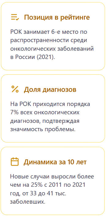 Чтобы понять масштаб проблемы в России, достаточно взглянуть на статистику. РОК стабильно входит в число самых распространенных видов рака. По данным за 2021 год, он занял четвертое место, уступая только раку молочной железы, кожи и раку легких. На его долю пришлось более 7% от всех онкологических диагнозов.