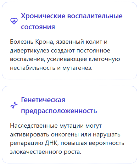 Возраст 50+, семейная история, длительный колит (язвенный колит/болезнь Крона) повышают риск.