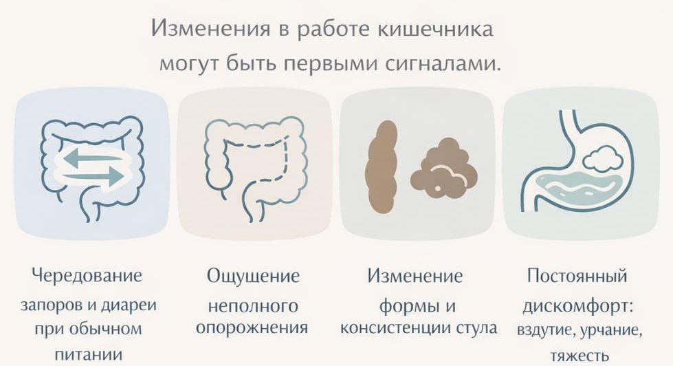 На ранних стадиях опухоль, как правило, растет бессимптомно, но есть тревожные «звоночки», которые нельзя игнорировать. Первыми признаками обычно становятся изменения в работе кишечника: