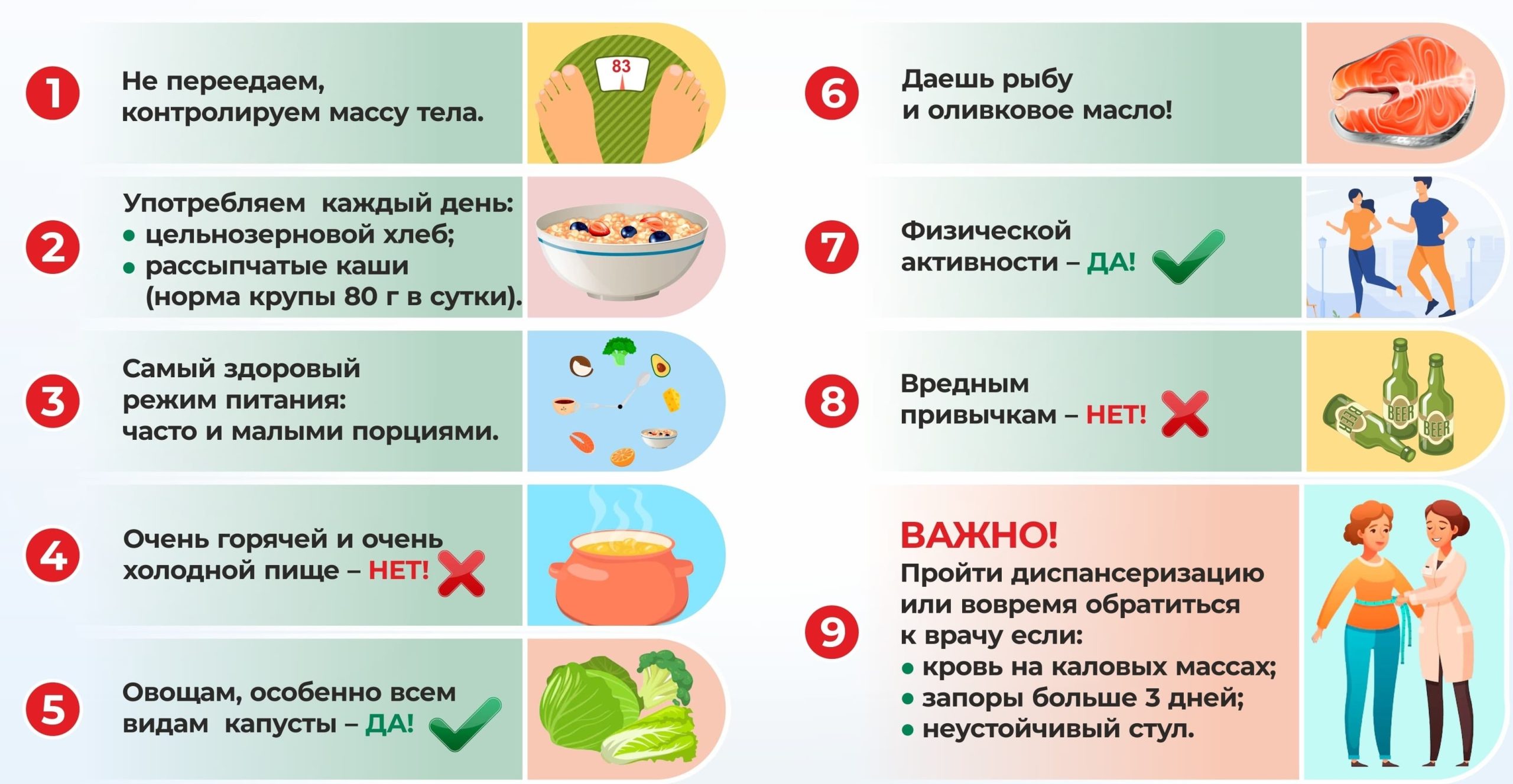 Снизить вероятность развития рака толстой кишки можно, скорректировав образ жизни. Основной акцент на питание. В рационе должно быть больше продуктов с клетчаткой — овощи, фрукты, цельнозерновые крупы. Следует ограничить продукты вторичной переработки (сосиски, колбаса), избыток красного мяса, копчености.